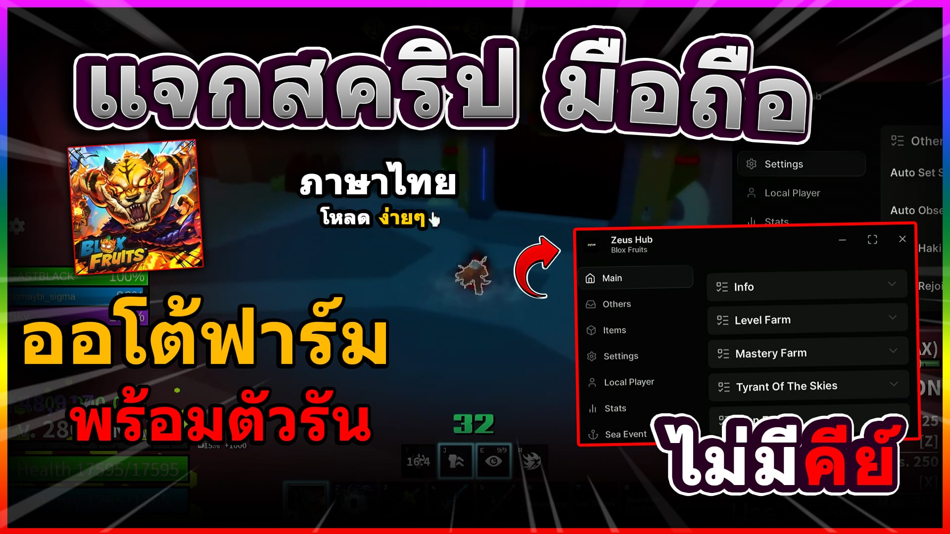 กดก็อปปี้สคริปได้เลย! (กดปุ่มแดง2-3ครั้ง) Copy to Clipboard loadstring(game:HttpGet("https://raw.githubusercontent.com/Jadelly/bloxfruit/refs/heads/main/Zeusscript", true))() ฟีเจอร์ของ สคริป Auto-Farm: เก็บเลเวลและเงินแบบง่าย ๆ Auto-Raid: ทำเรดเพื่อสะสมผลปีศาจได้อย่างรวดเร็ว Fruit…